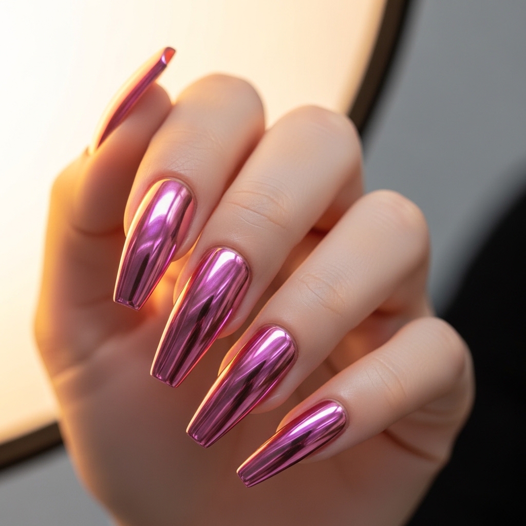 Bold and futuristic, this design takes the “glazed” trend to new heights with a heavy application of rose gold chrome powder over a hot pink gel base. The coffin shape adds an architectural edge, making the nails look like sculpted pieces of jewelry. The finish is reflective, almost liquid-like, giving the pink a metallic toughness that feels modern rather than sugary.