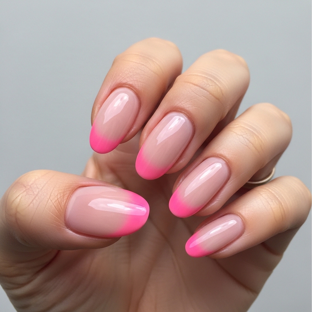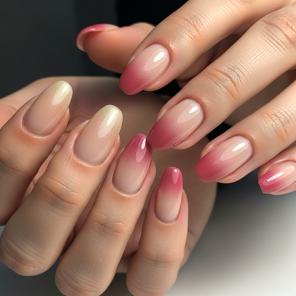 This design is a masterclass in color transition, featuring a seamless gradient that flows from a nude-beige at the cuticle to a vibrant petal pink at the tip. To finish, a “pearl” top coat is applied, giving the entire nail a soft-focus, ethereal glow. The oval shape is chosen for its classic, flattering appeal on all hand shapes.