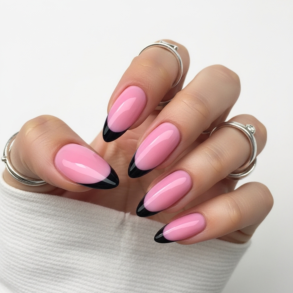 A dramatic twist on a classic, this design features a bubblegum pink base with ultra-thin, “micro” French tips in a glossy black. The contrast is unexpected and slightly edgy, nodding to the “Gothic Romance” trends seen on recent runways. The shape is a medium almond, which balances the sharpness of the black tips with a rounded, feminine curve.