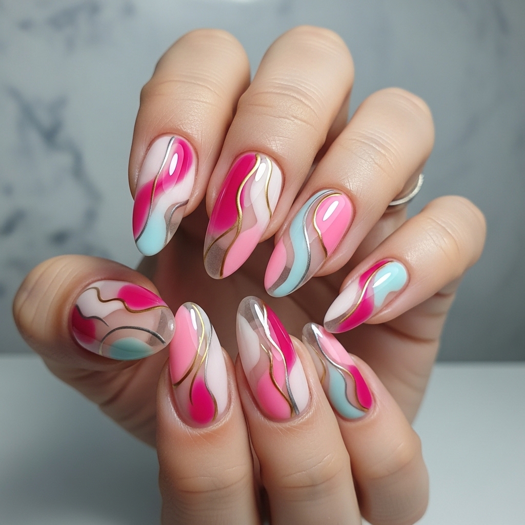For the modern artist, this design leaves parts of the natural nail exposed (negative space) while decorating the rest with bold, abstract swirls of fuchsia and pale pink. The long oval shape provides a large canvas for the flowing lines, which are designed to mimic the movement of silk ribbons.