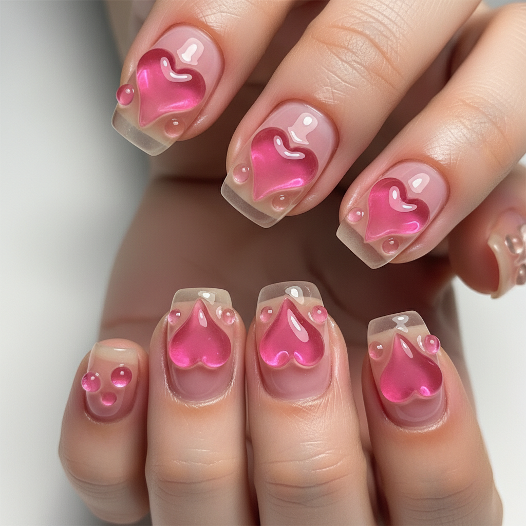 Using clear builder gel to create “water droplet” hearts, this design is all about translucency. A base of jelly pink-a sheer, see-through pigment-is applied first, followed by raised, clear 3D hearts that look like bubbles or glass. The short round shape enhances the “jelly” aesthetic, making the nails look like delicious pieces of hard candy.