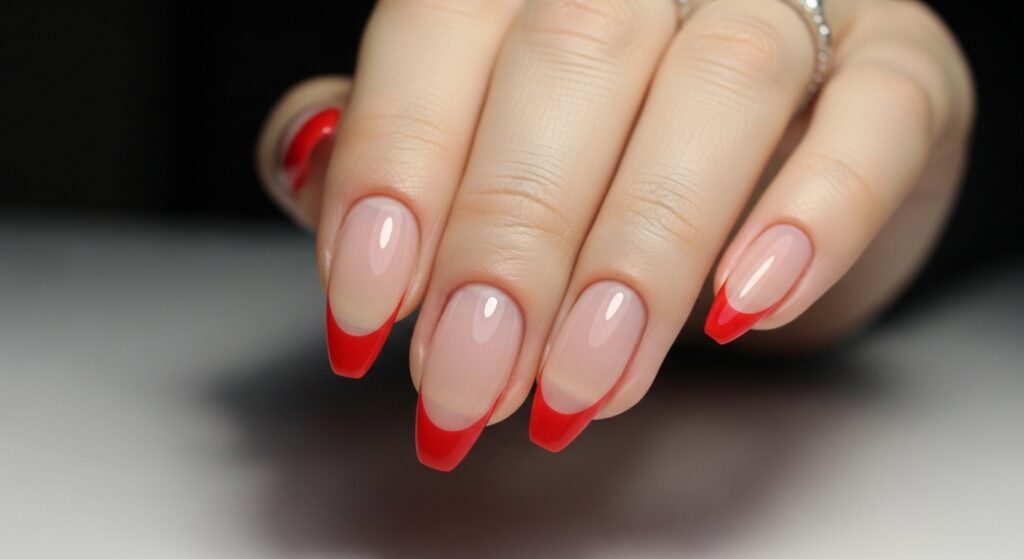 This modern interpretation of the French manicure replaces white tips with refined red edges on a sheer base. The contrast feels crisp yet romantic. It is stylish because it reinvents a classic in a Valentine-appropriate way without becoming novelty-driven. Ideal for professional settings or elegant dinners, this look balances comfort through its familiar silhouette and trendiness through its unexpected color choice.