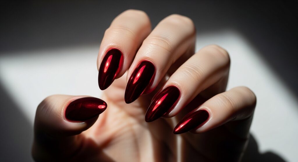 Red chrome nails combine a bold red base with a reflective chrome glaze that catches light subtly. The effect feels futuristic yet romantic. This design is stylish because it introduces shine without heaviness. Ideal for those who want a statement look, it balances comfort through its smooth surface and trendiness through its modern reflective finish.