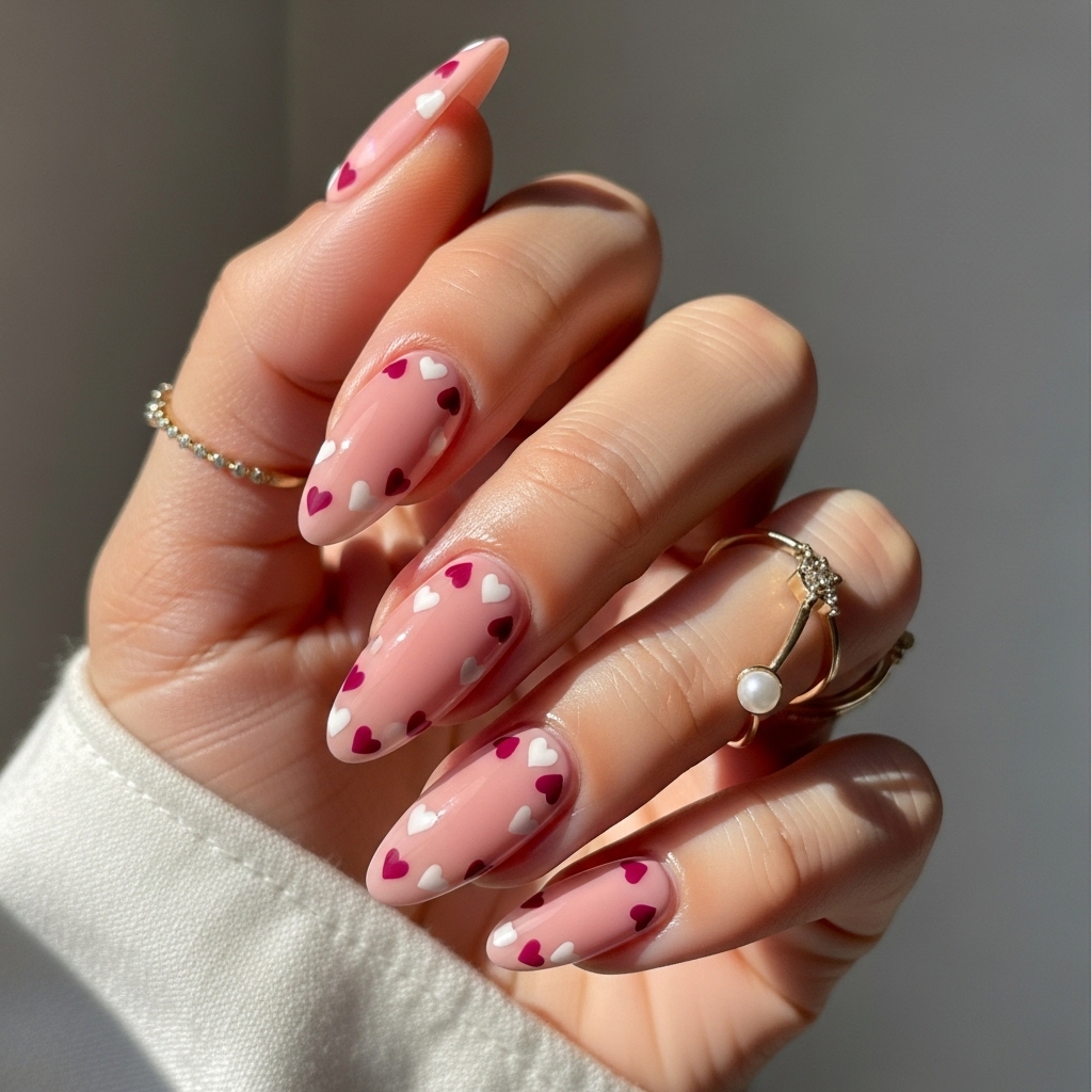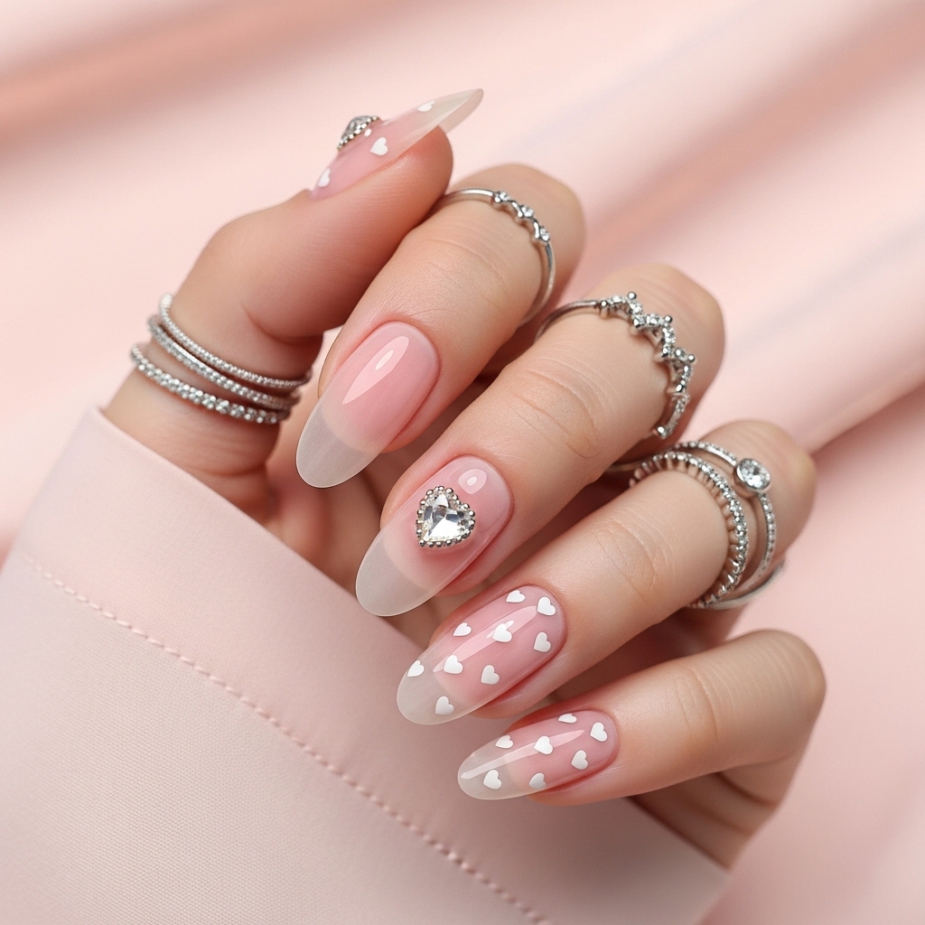 This oval shaped design features a translucent pink base that mimics a natural nail tint. Tiny crystal embellished hearts sit at the center of accent nails, while others display micro white heart outlines for balance.