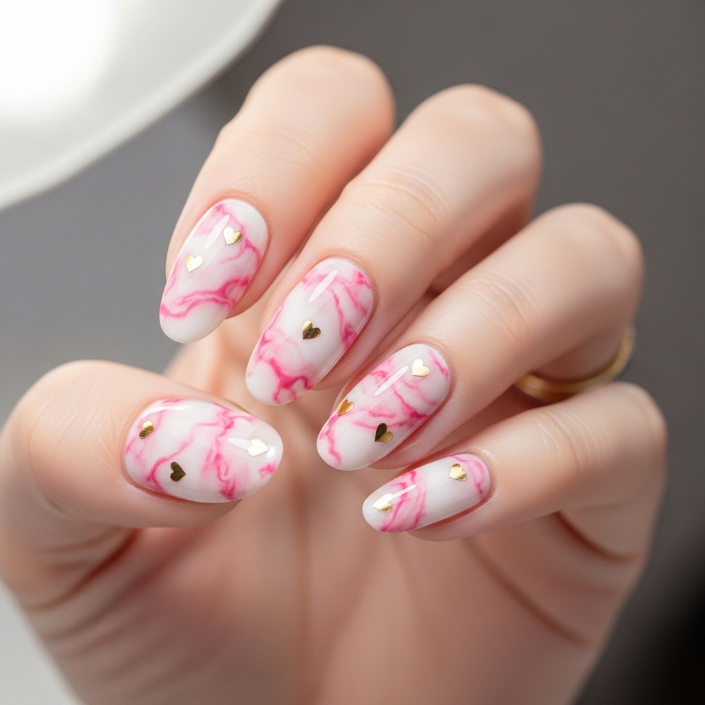 Medium oval press on nails featuring a soft pink and white marble effect create a luxurious base. Tiny gold foil hearts are embedded within the marble swirls, adding texture and dimension.