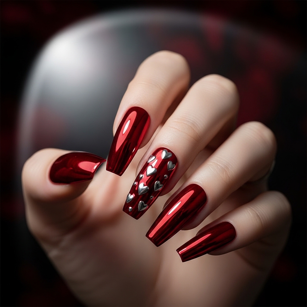 This coffin shaped set features a rich ruby red base with a subtle chrome sheen. Tiny metallic silver hearts are placed near the tips or clustered in asymmetrical patterns on accent nails. The reflective finish catches light beautifully, creating a luxe, statement making manicure.
