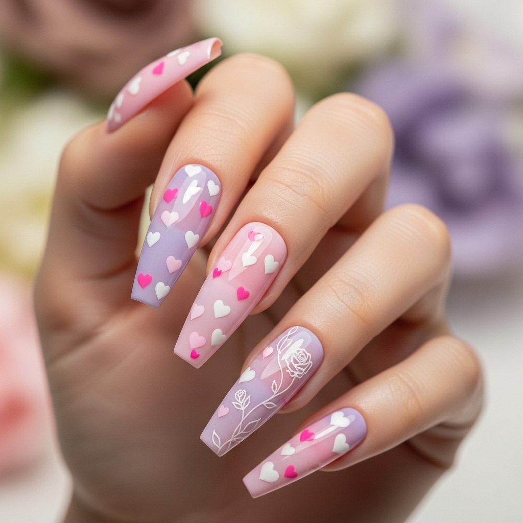Long stiletto press on nails painted in alternating pastel pinks and lilacs create a dreamy base for scattered micro hearts in white and baby pink. Some nails feature subtle floral line art intertwined with the hearts for added artistry.