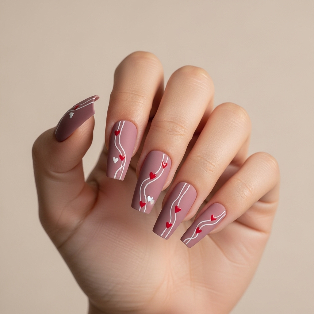 This medium length coffin set showcases a velvety matte mauve finish. Thin white line art forms abstract curves across the nails, intersected by tiny red hearts placed strategically along the lines.