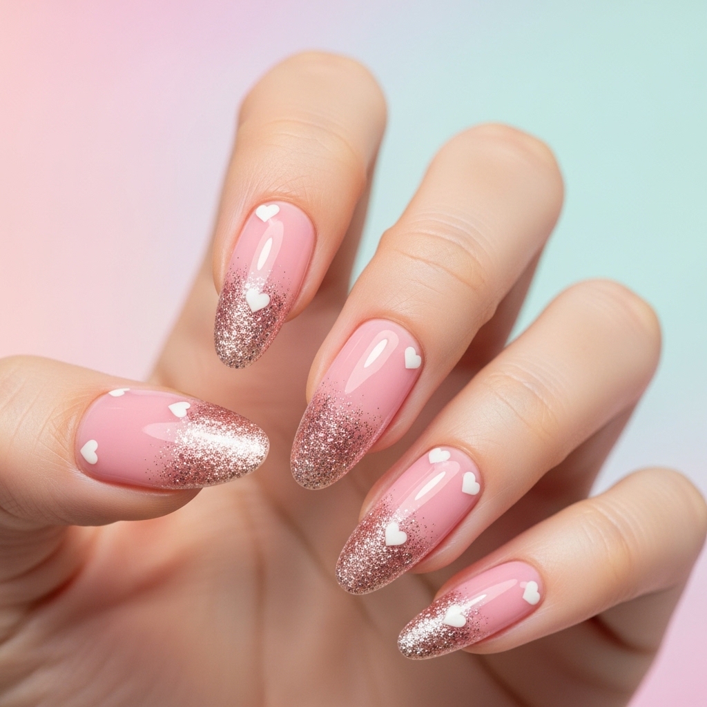 This almond shaped design blends a soft baby pink base into a fine rose gold glitter fade toward the tips. Tiny white hearts are placed near the cuticle on each nail, creating a delicate contrast against the shimmer.