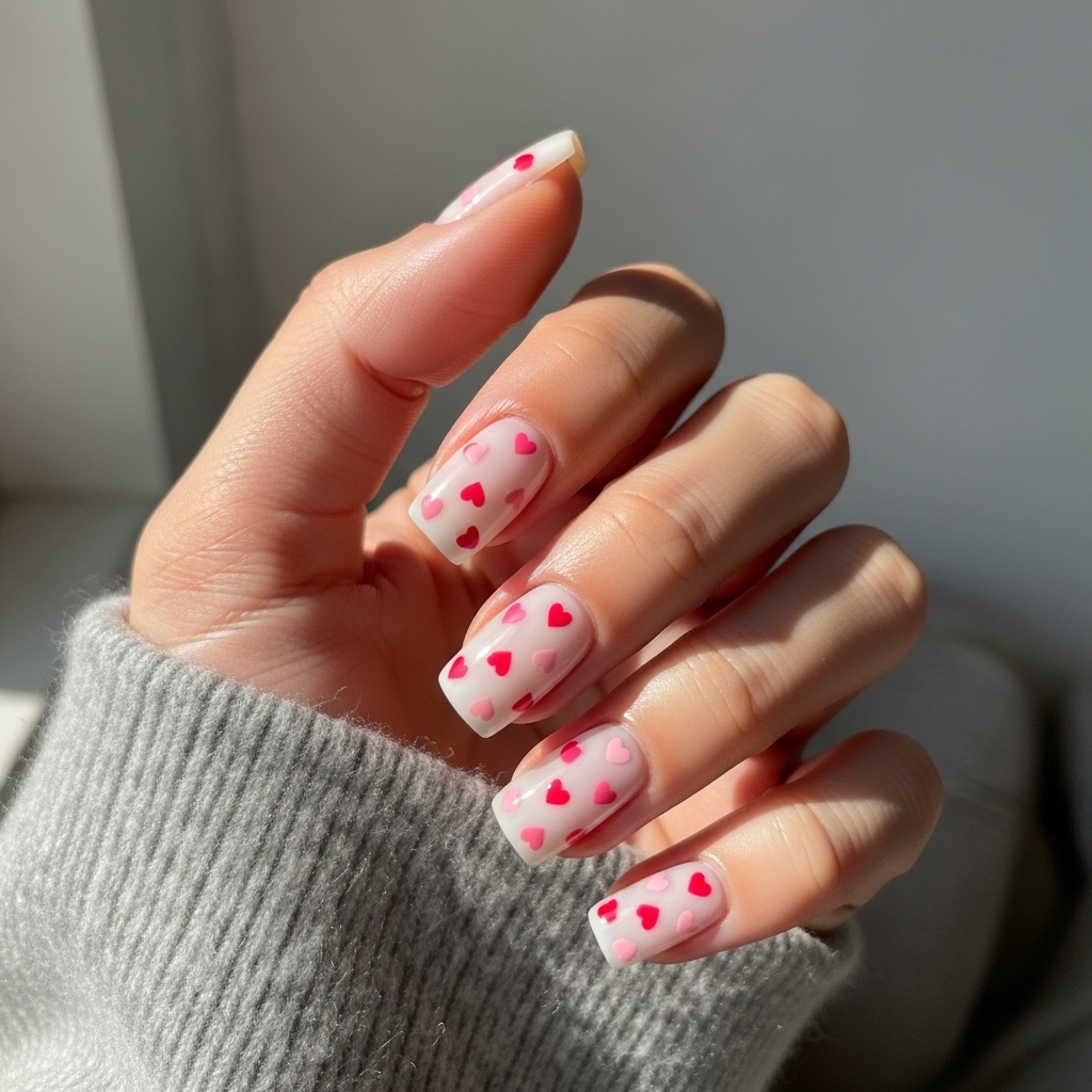 Short square press on nails with a milky white base create a clean canvas. Tiny pink and red hearts are spaced evenly across each nail, offering a playful but minimalist pattern.