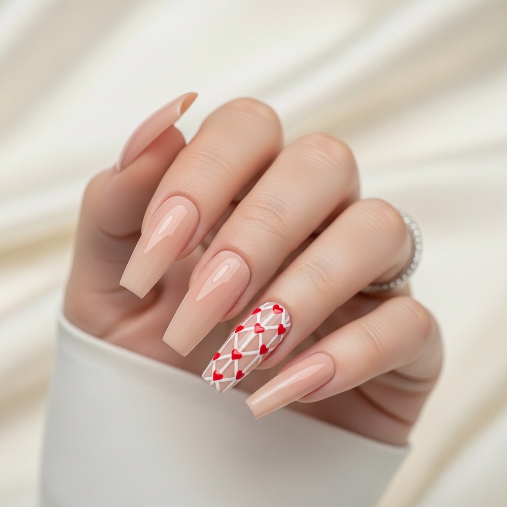 A soft nude base covers long coffin shaped nails, topped with a delicate white lattice pattern across two accent nails. Tiny red hearts are placed at select intersections, creating a subtle dimensional effect.