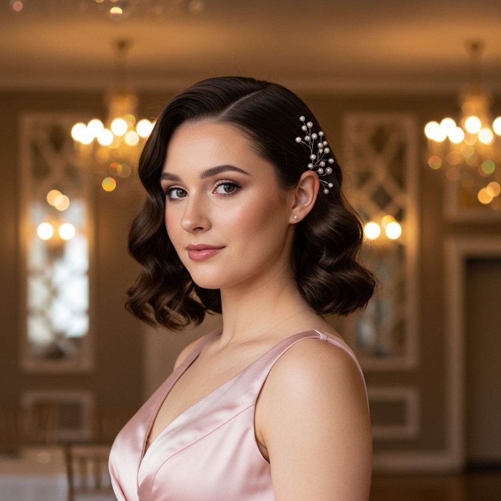 This look enhances a softly curled long bob with delicate pearl pins placed along one side. The accessories are subtle and refined rather than overpowering.