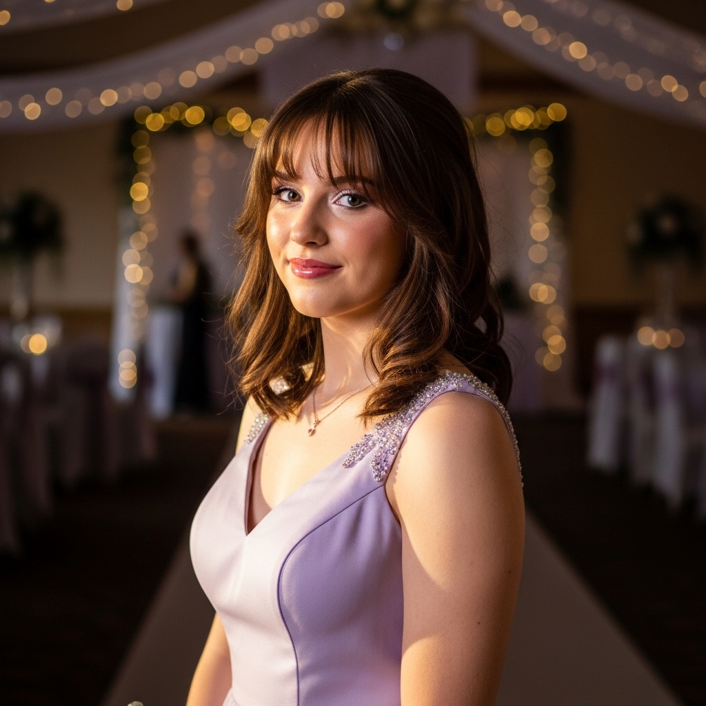 It suits romantic, vintage inspired dresses and adds youthful charm. The length keeps the look manageable, while the bangs introduce a fashionable update that feels aligned with current trends. It is sweet, modern, and comfortable for a full evening of celebration.
