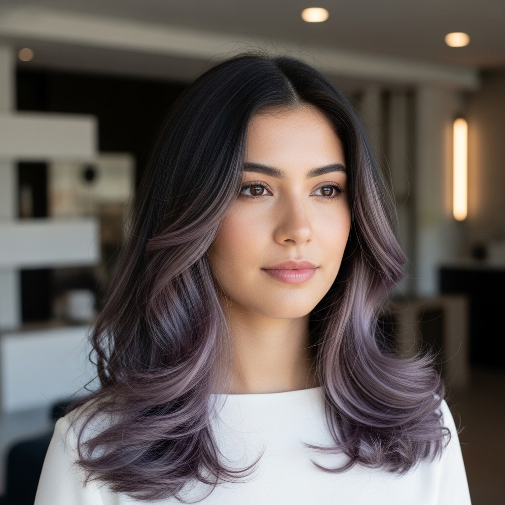 For those seeking a creative twist, smoky lilac tint layered over brunette hair offers a subtle wash of cool purple tones. The effect is understated and visible mainly in certain lighting.