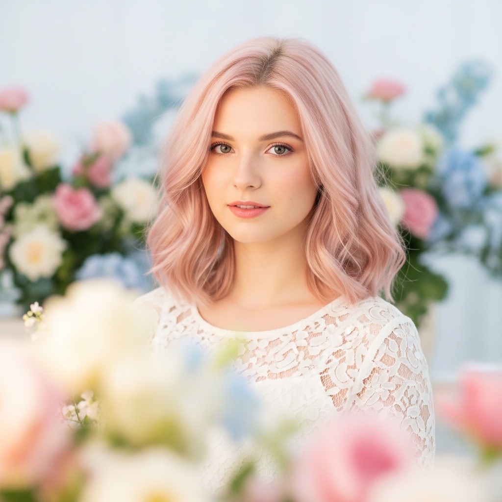Pastel rose blonde adds a faint blush pink overlay to a light blonde base. The color is soft and translucent, creating a romantic and playful effect.