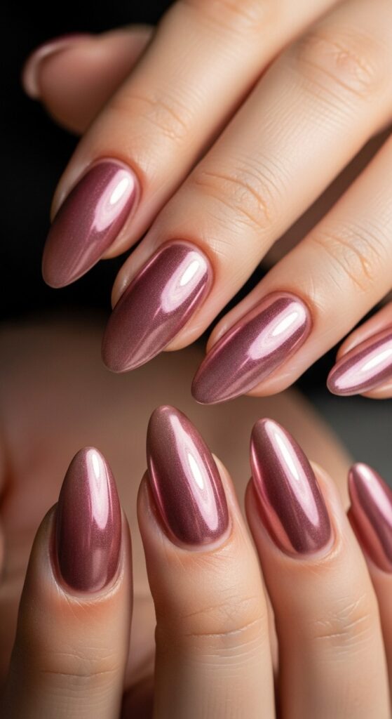 Soft champagne or blush shimmer nails reflect light delicately, offering a celebratory yet elegant vibe. Ideal for evening outings or romantic dinners, this design feels festive without being overpowering. The shimmer adds trend appeal, while the neutral tone ensures versatility. Smooth finishes keep it comfortable for extended wear.