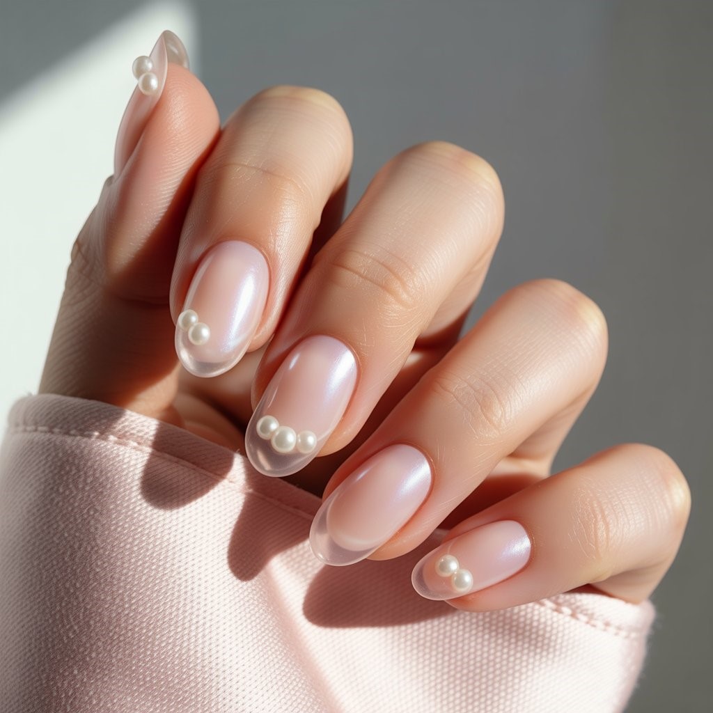 This manicure features a milky pink base enhanced with pearl or iridescent accents. The soft glow reflects light beautifully, making it ideal for daytime dates or elegant gatherings. Its charm lies in its simplicity and delicate finish, offering a romantic look without heavy decoration. Trend-forward yet practical, this design pairs well with both casual and dressy outfits, maintaining comfort while delivering a polished, feminine aesthetic.