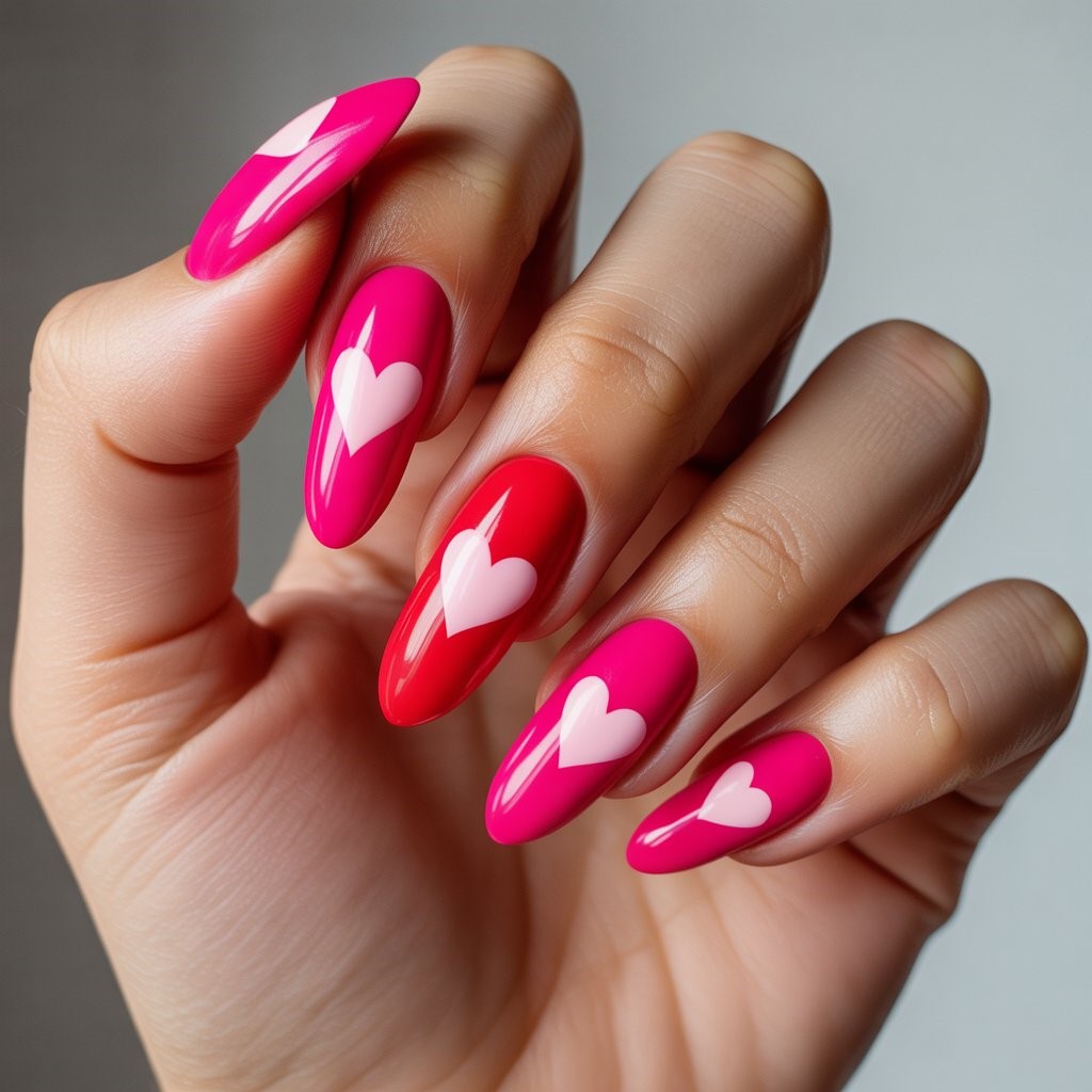 A high-shine pink manicure with bold heart accents or statement nails creates a confident, romantic look. Ideal for festive dates or girls’ night celebrations, this design embraces Valentine energy fully. The glossy finish feels fresh and youthful, while structured nail shapes keep it sophisticated. Despite its playful appearance, the clean application ensures durability and comfort, making it both fashionable and functional.