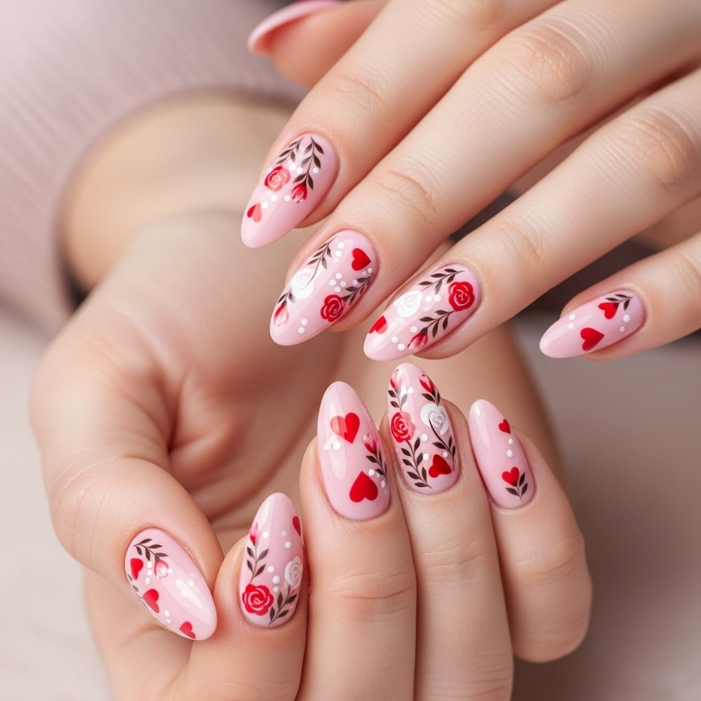 Soft florals painted in pinks, reds, or whites create a dreamy Valentine look. Often placed on accent nails, the design feels artistic yet wearable. Perfect for daytime dates or special occasions, it brings a soft romantic narrative to your manicure. The floral elements add trend appeal, while the controlled placement keeps it comfortable and practical for daily wear.