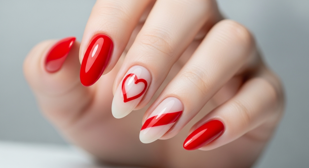 This contemporary design combines bold red polish with intentional negative space. The contrast feels artistic and high-fashion, perfect for trend-focused individuals. It works well for creative events or stylish dates. The open space keeps the design breathable and comfortable, while the red elements anchor it firmly in Valentine aesthetics.