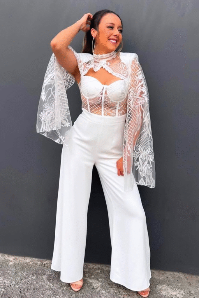 Flowing, feminine, and powerful—this combination of lace and satin captures modern elegance. The cape adds drama, while the palazzo pants ground the look in timeless refinement. It’s perfect for those who prefer sophistication with subtle flair.