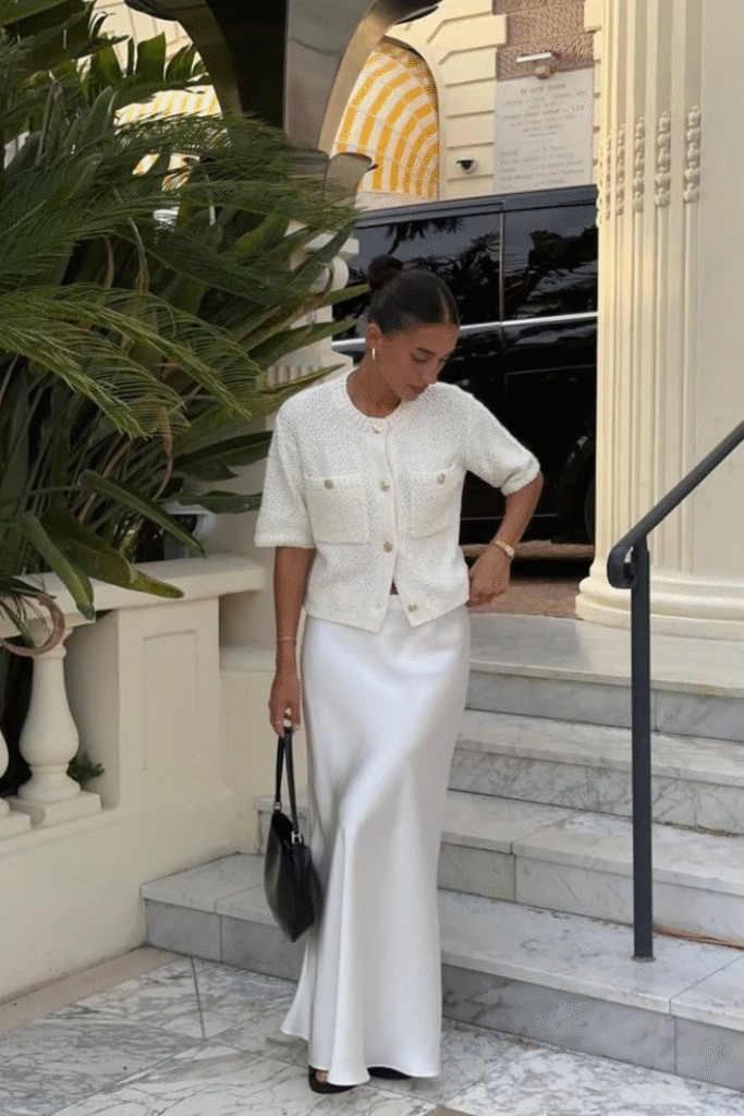 Classic yet fresh, this look combines cozy bouclé texture with the smooth drape of satin. It’s ideal for transitional weather or semi-formal evening events, offering both comfort and polish.