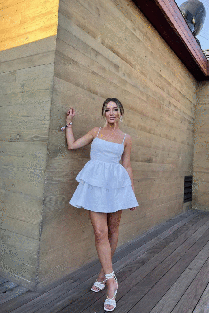 15. Tiered Cotton Mini Dress with Strappy Heels