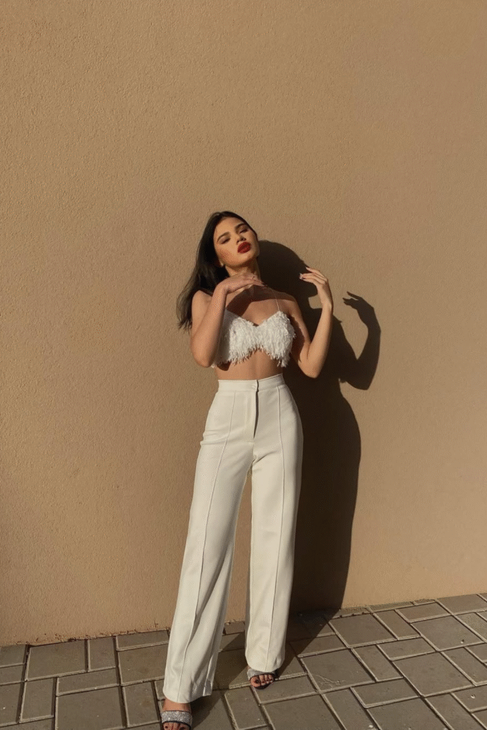 Bold yet elegant, this outfit pairs daring design with timeless tailoring. The feathered bralette introduces texture, while the high-waisted trousers maintain sleek sophistication. It’s an ultra-chic combination for fashion-forward partygoers.