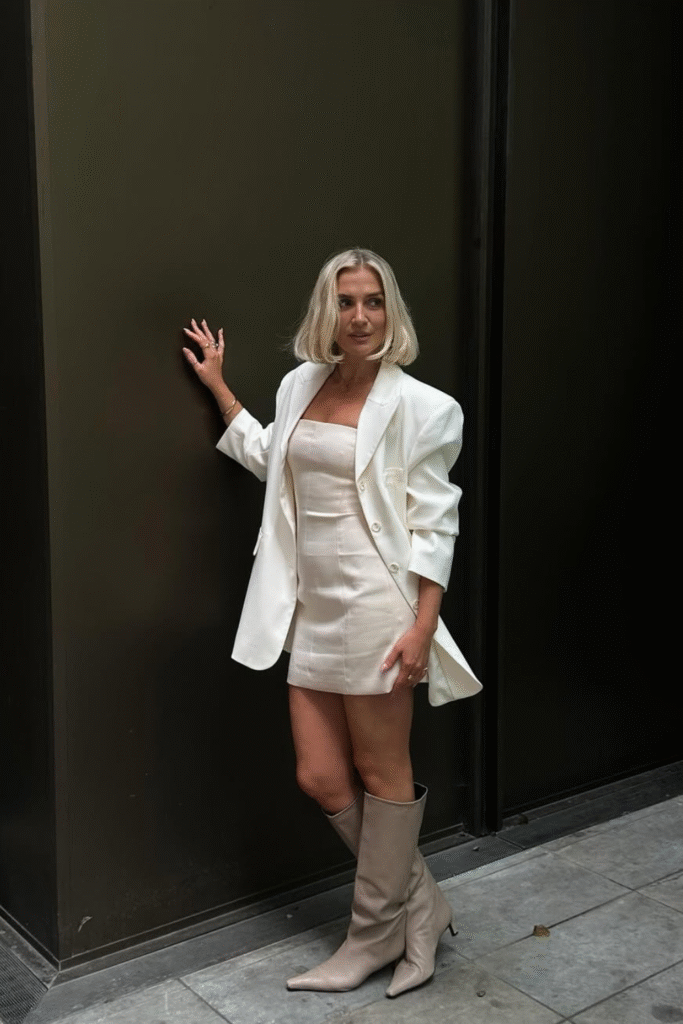 4. Ivory Strapless Mini Dress with Oversized Blazer