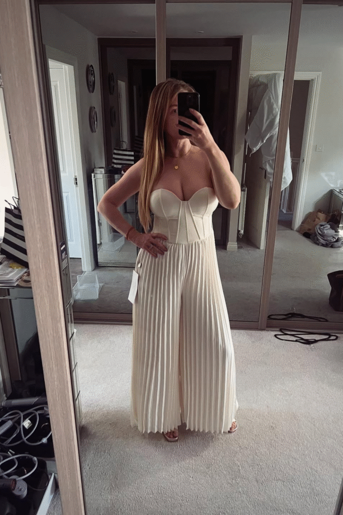 An elevated take on the all-white jumpsuit, this outfit merges modern tailoring with soft femininity. The pleated palazzo pants add flow and movement, while the corset bodice ensures structure. Ideal for chic parties or elegant dinner celebrations.