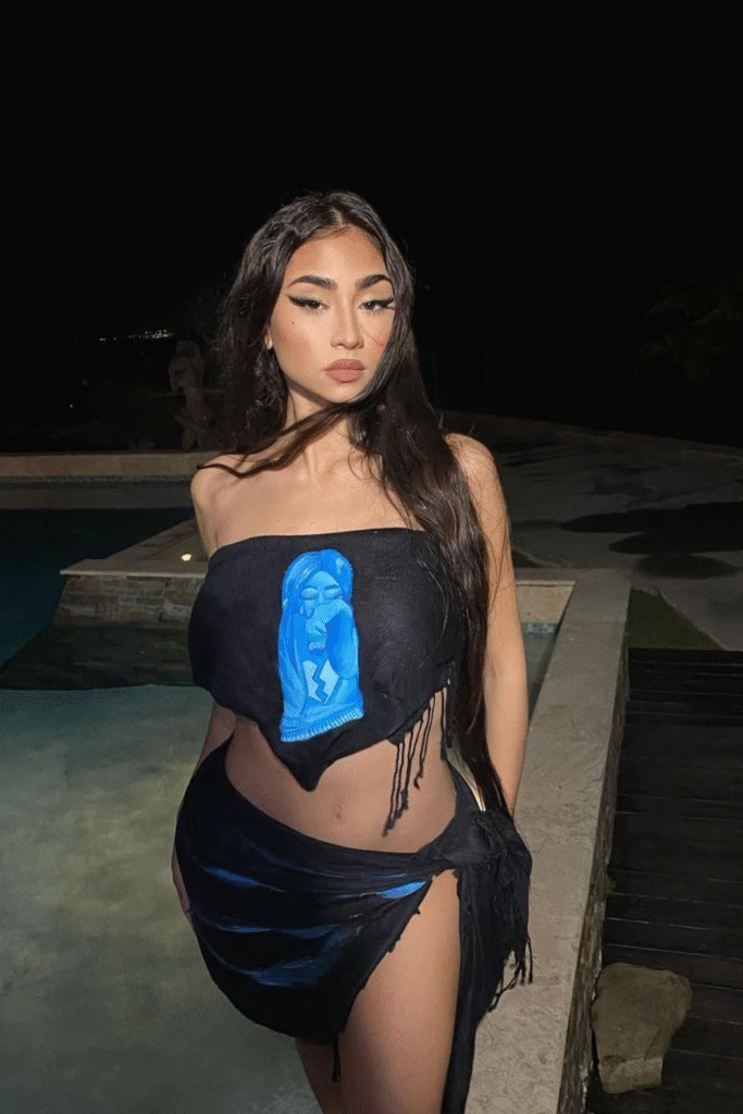 Feminine meets fearless in this show-stopping look. The tulle ruffles add volume and texture, while crystals bring the sparkle. Designed for spotlight moments, this outfit commands attention with elegance — a true blend of baddie attitude and fairytale flair.