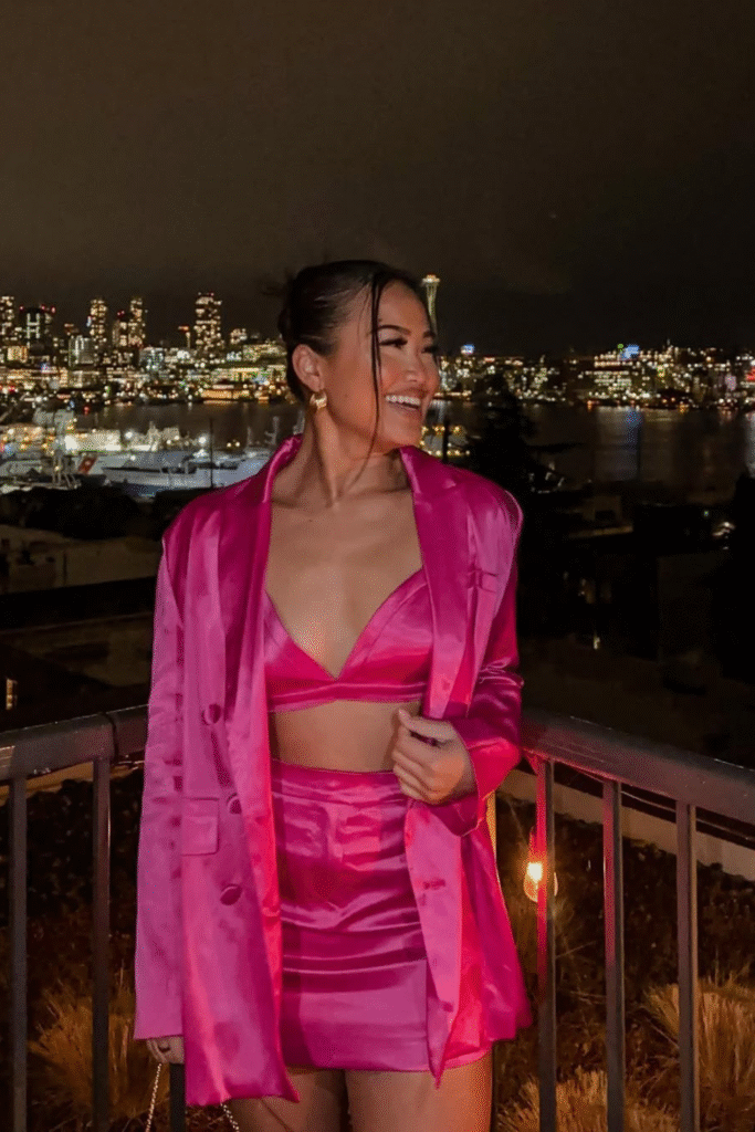 Bold, sleek, and unapologetically confident — this matching set is a baddie essential. The fuchsia satin radiates vibrancy, while the tailored blazer balances the look with polish. It’s powerful yet playful, making it perfect for an unforgettable girls’ night or luxe dinner date.