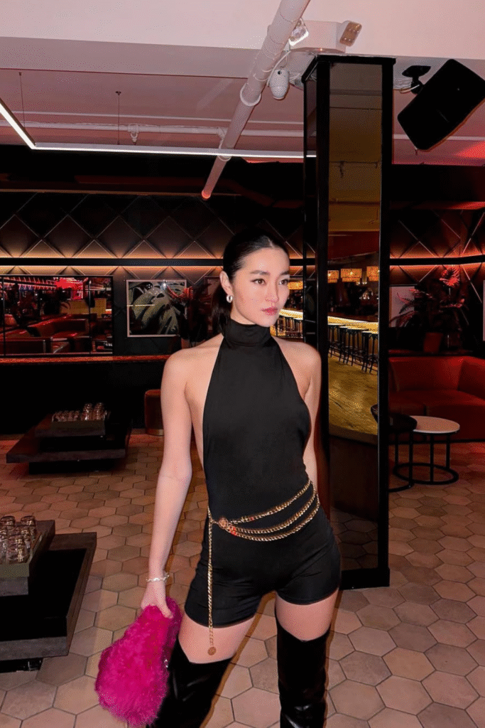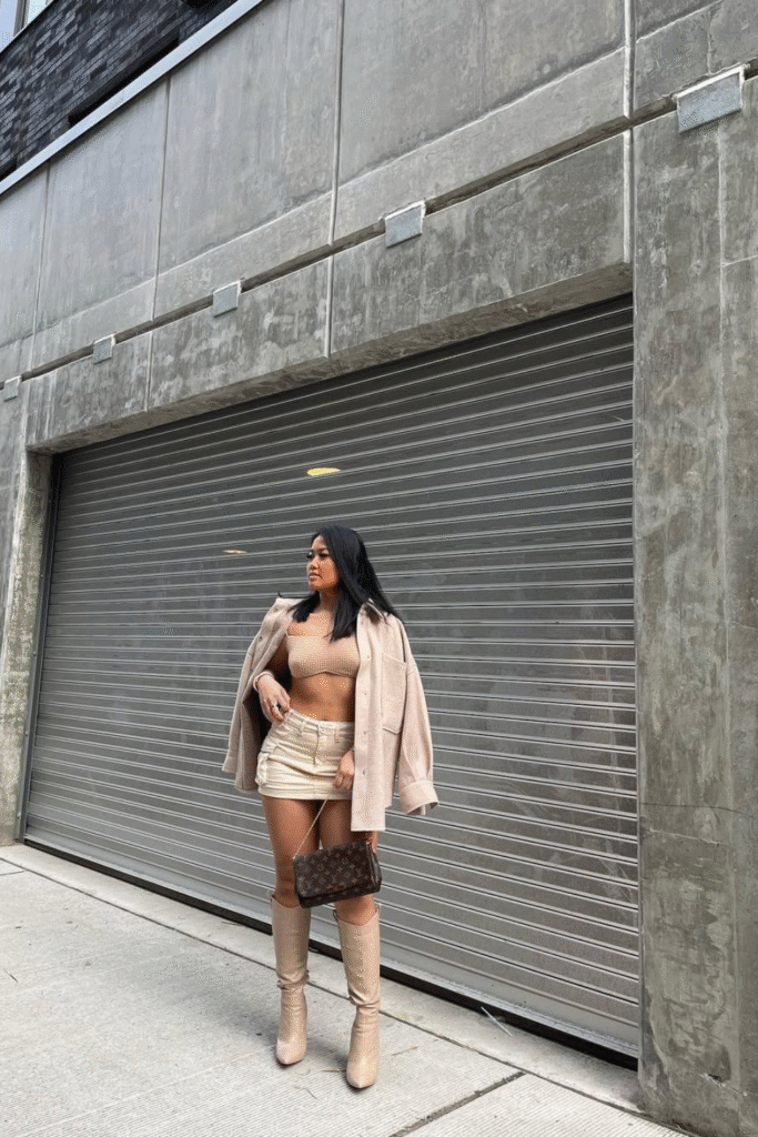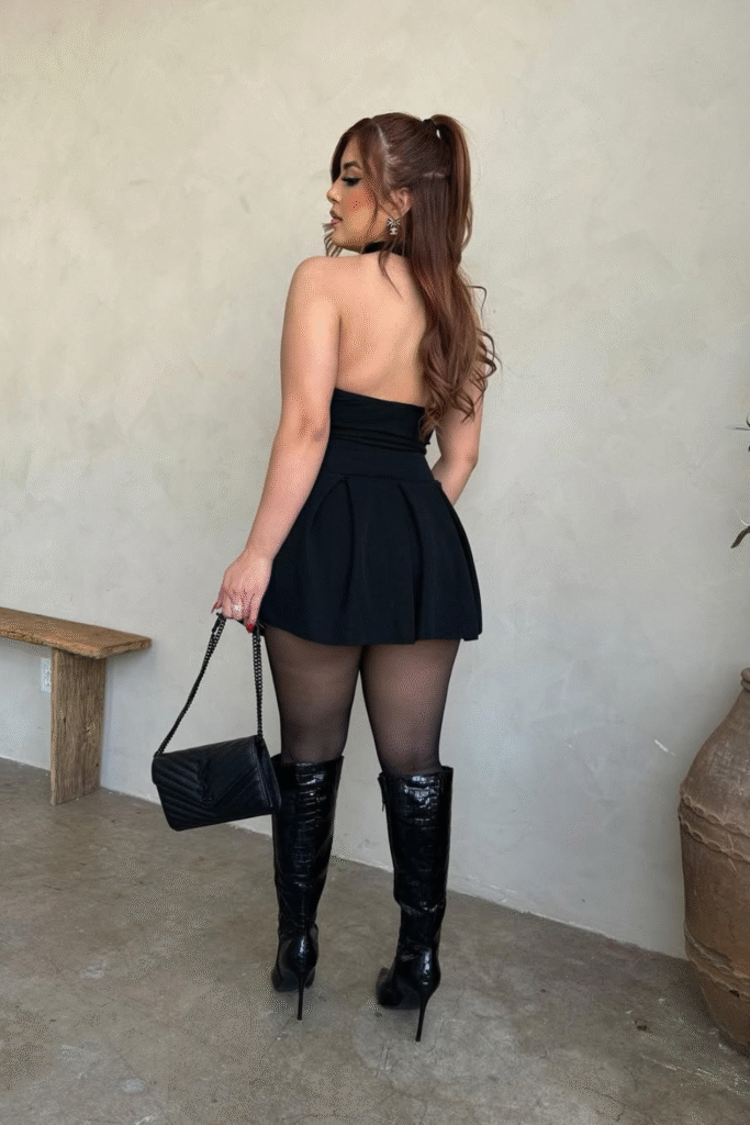 The ultimate power move for a night on the town. The strapless silhouette enhances your curves, while patent boots bring the drama. It’s equal parts sultry and street-style cool, ideal for when you want to keep things simple yet unapologetically bold. A true baddie never needs to overdo it — this look proves that.