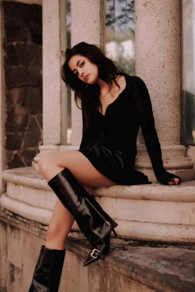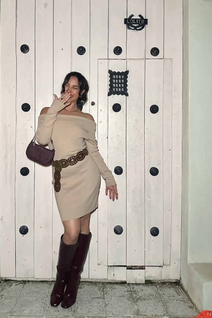 For cooler nights, this cozy-meets-couture outfit is the ultimate choice. The off-shoulder neckline adds subtle allure, while the boots bring a rich seasonal tone. Perfect for city strolls or intimate gatherings, it’s a refined twist on baddie confidence.