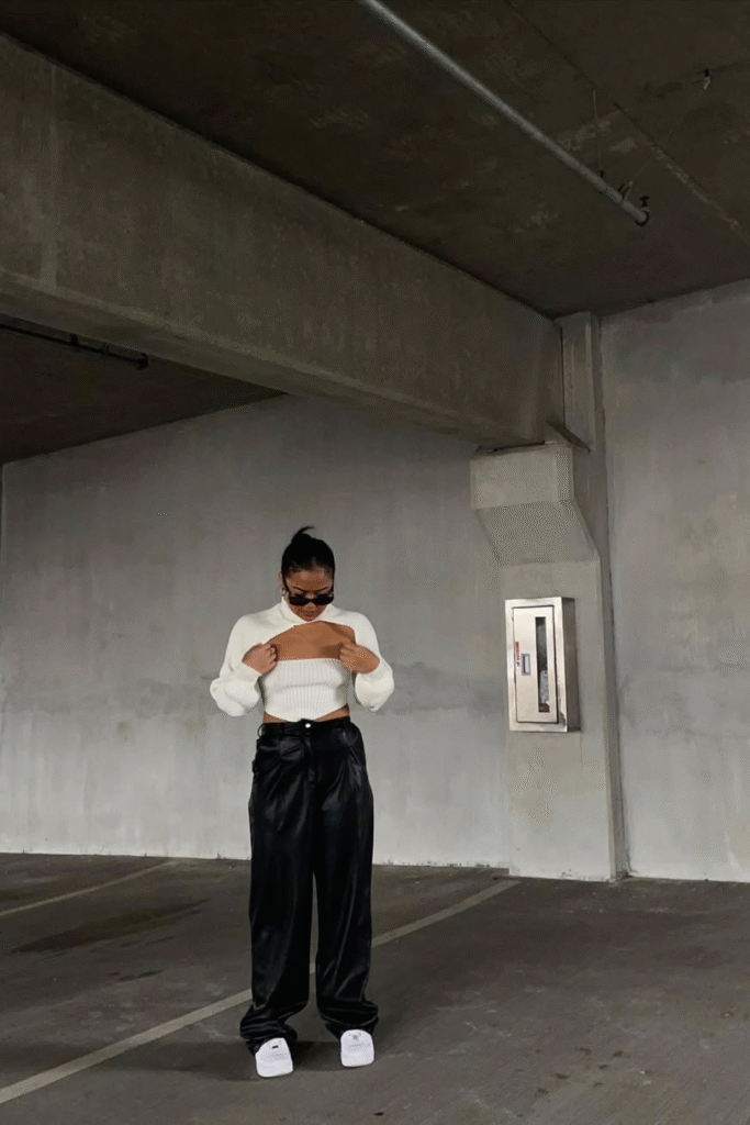 Effortless sophistication meets baddie cool. The knit cutouts create a structured yet sensual silhouette, while satin trousers add fluid movement. Ideal for dinners or late-night lounges, this look is modern, sleek, and perfectly balanced.