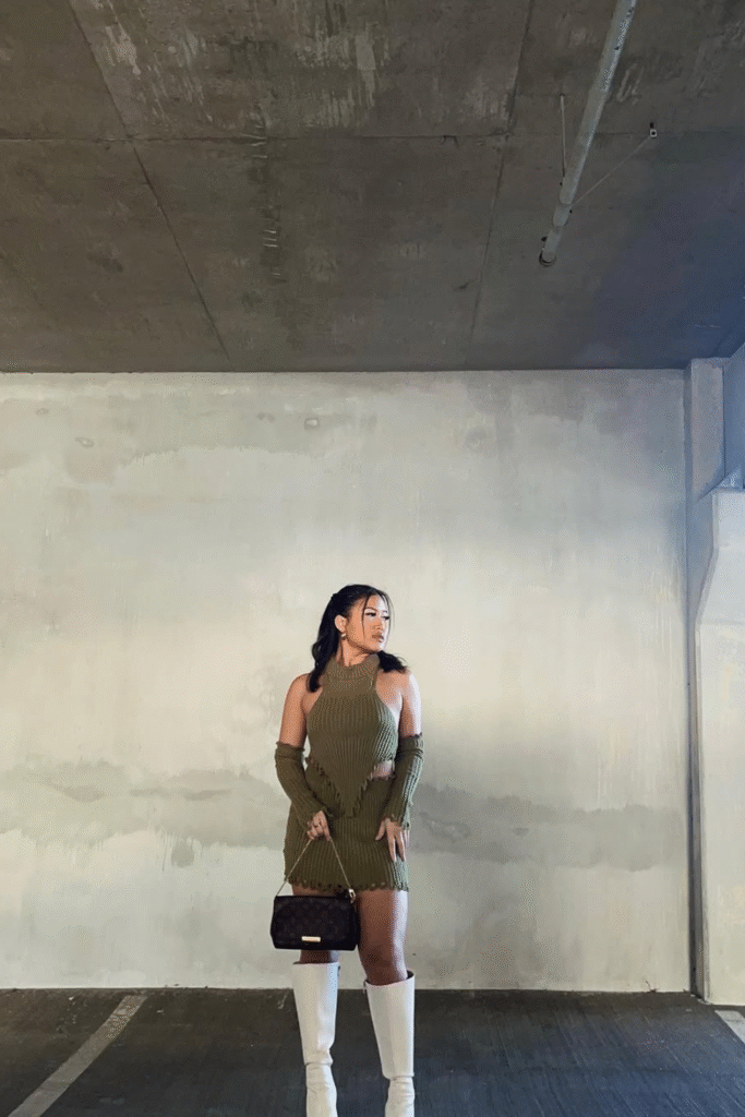 Playful and chic, this combo radiates confidence with minimal effort. The olive hue feels rich and warm, while ivory boots add a fresh contrast. It’s that perfect “out all night” energy — fun, flirty, and fashion-forward.