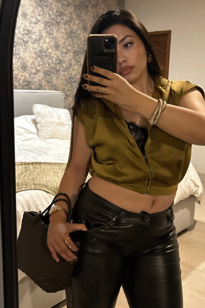 Effortless yet commanding, this combination defines downtown chic. The olive blouse offers a rich contrast to the edgy leather pants, creating a look that’s both refined and fearless. Perfect for a late-night dinner or a city stroll, it delivers the perfect mix of softness and strength — exactly what every baddie night out should be.