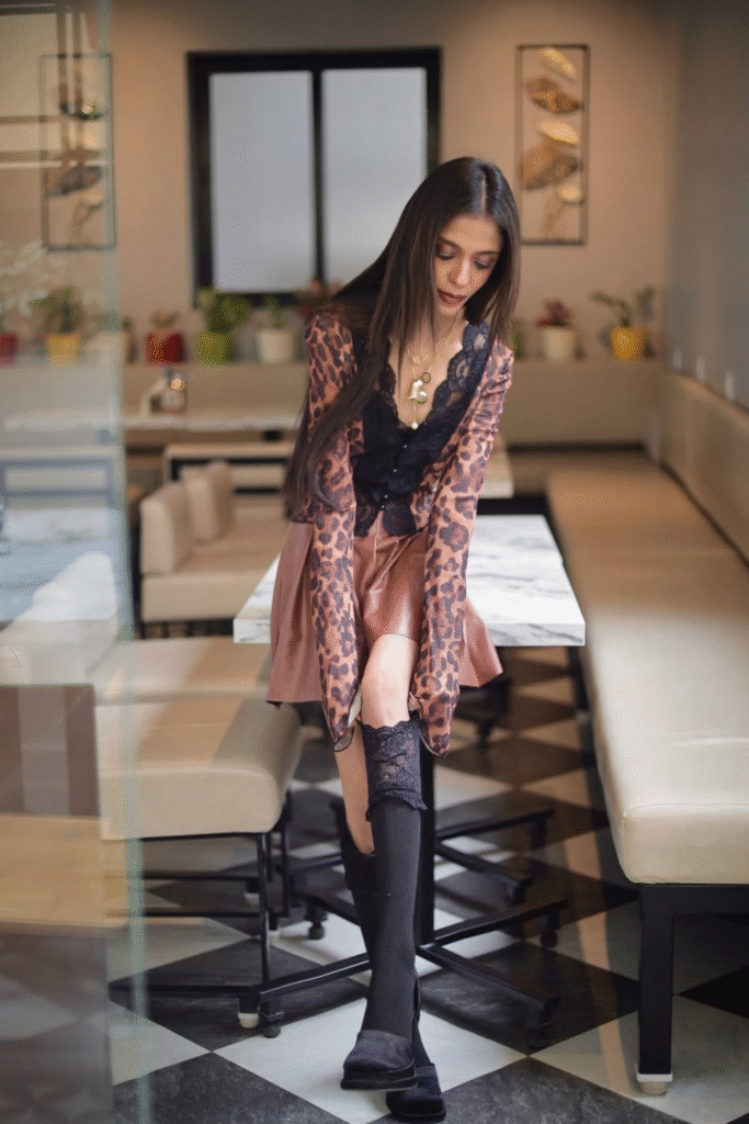 For those who live to stand out, this outfit captures wild elegance at its best. The sheer leopard print contrasts perfectly with the delicate lace and bold leather, creating a layered look full of texture and intrigue. It’s the kind of statement outfit made for confident nights and camera flashes.