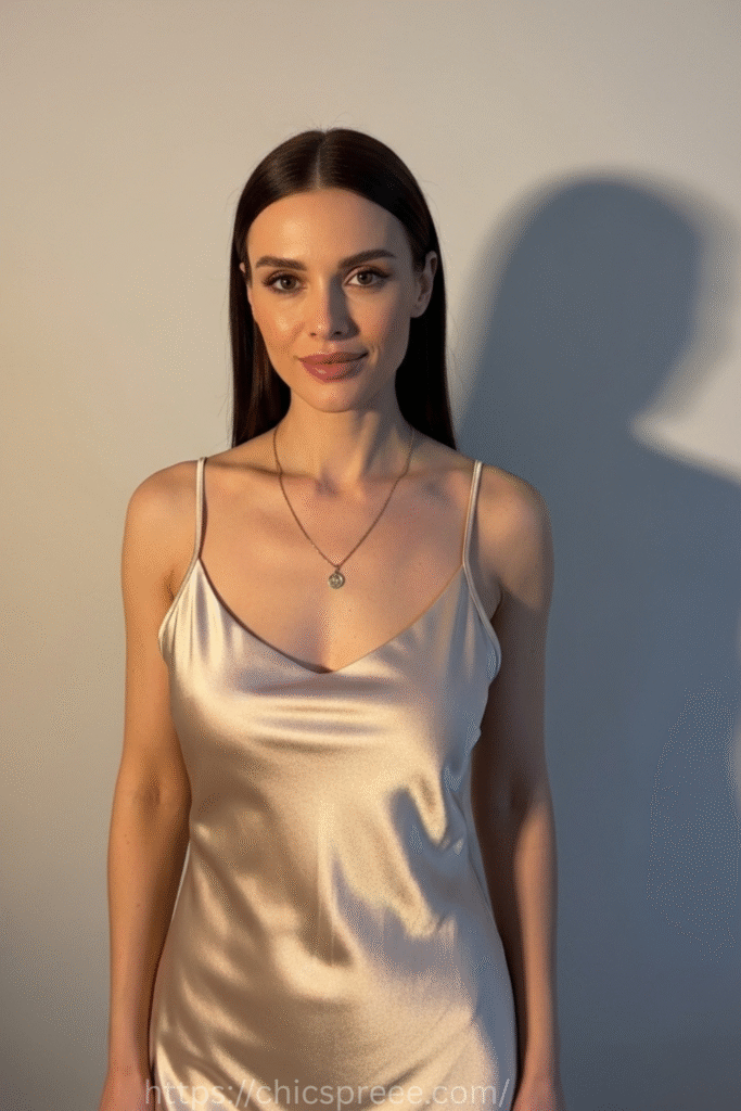 Choose a satin slip in champagne, emerald, or burgundy. Layer with a cropped faux-fur jacket, delicate layered necklaces, and ankle-strap heels for a chic, effortless vibe.