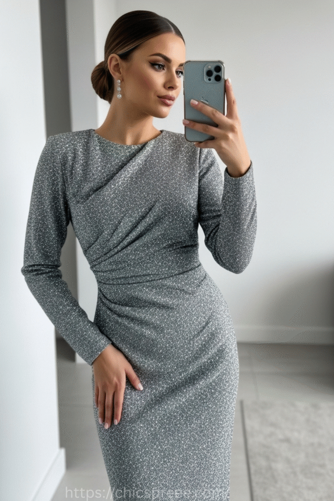 A glittery bodycon midi in silver or black is elegant but party-ready. Add ankle-strap heels, soft curls, and a clutch for refined glam.
