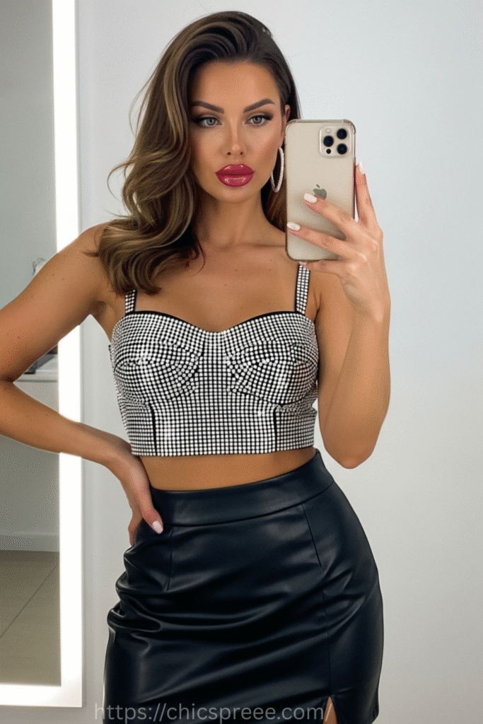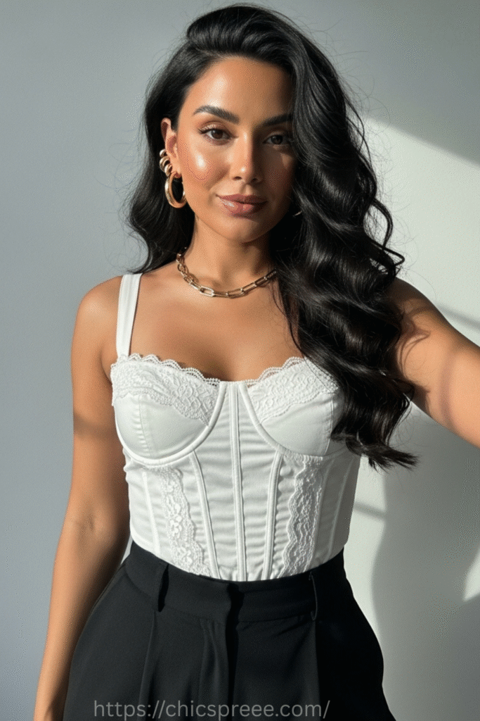 Style a satin or embellished corset top with high-waisted wide-leg pants. Add pointed heels and a sleek ponytail for a trendy, figure-flattering outfit.