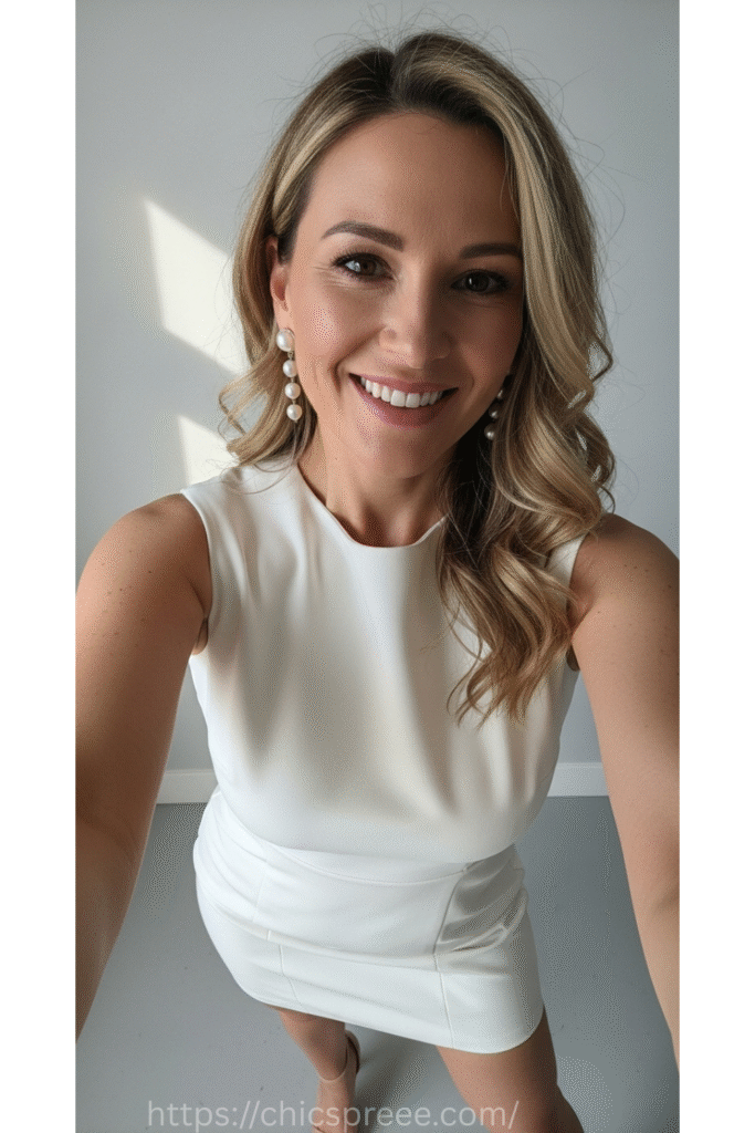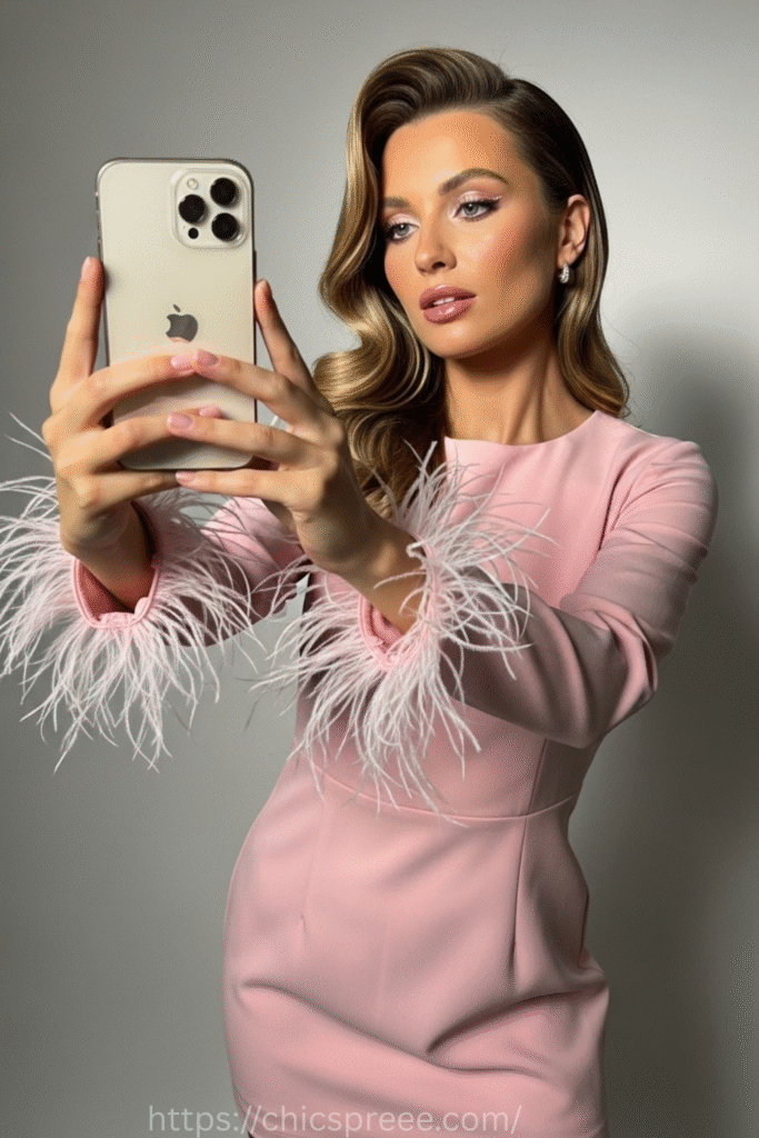 Wear a pastel or white mini dress with feather cuffs or hem. Add metallic heels and glossy waves for a playful, birthday-girl energy.