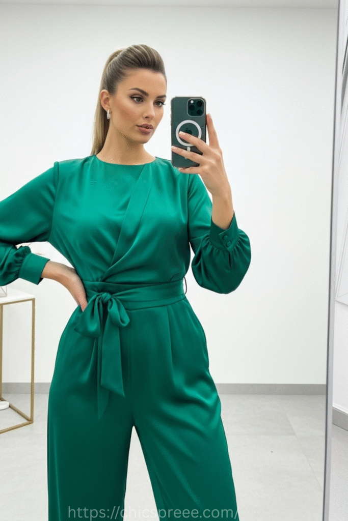 Opt for a tailored jumpsuit in jewel tones or sequins. Cinch the waist with a belt, add high heels, and finish with bold earrings for a power look.