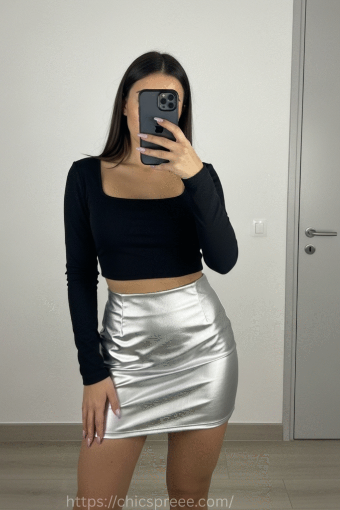 Pick a silver or gold metallic mini skirt and pair with a simple crop or corset top. Add platform heels and sparkly hoop earrings for a party-girl vibe.