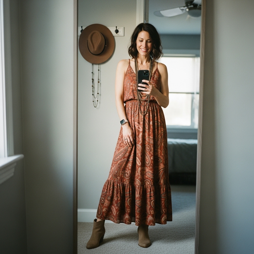 A long, flowy maxi dress in paisley or floral print perfectly captures the boho vibe while keeping you cozy in fall. Pair it with ankle boots for warmth and balance the flow of the dress. Add a floppy hat and layered jewelry for extra charm. This look is versatile enough for a coffee run, brunch with friends, or even a casual office day when styled with a cardigan.