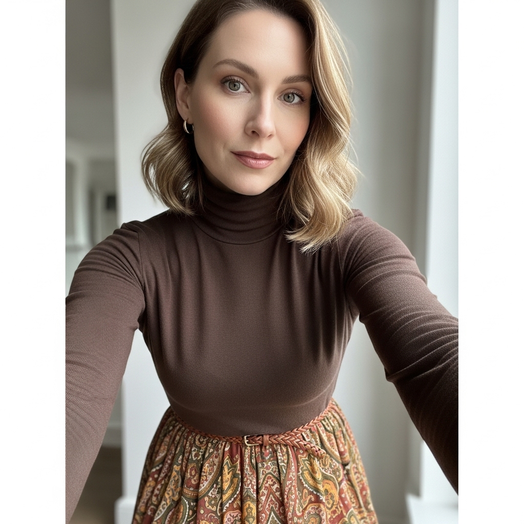 A fitted turtleneck tucked into a flowing midi skirt creates a classic yet boho-inspired fall look. The simplicity of the turtleneck lets the skirt shine, especially when it features paisley, floral, or geometric prints. Add knee-high boots and a statement belt to tie the outfit together. It’s a versatile style that can work for workdays, coffee outings, or even relaxed evenings while keeping you chic and warm.