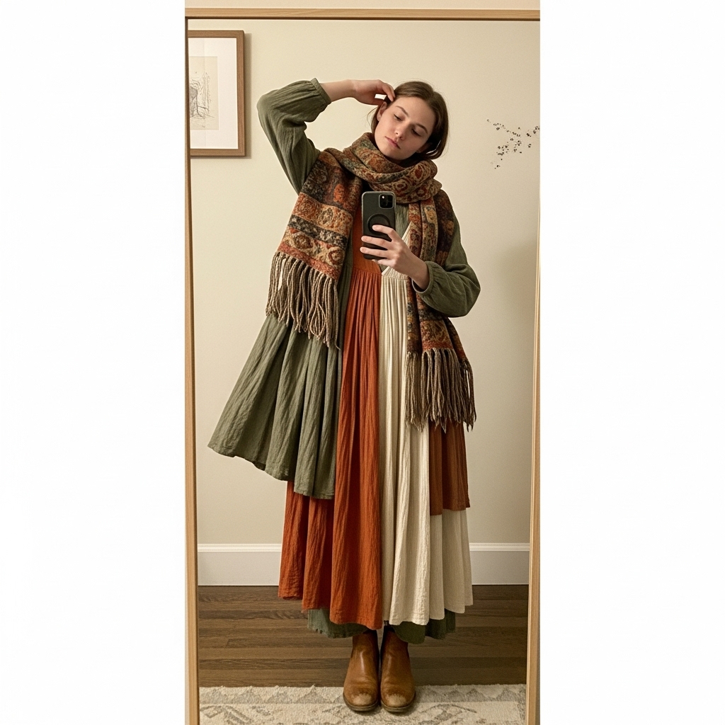 Layering a shorter dress over a longer one and adding an oversized scarf creates an eclectic boho aesthetic. This outfit plays with texture and dimension, making it perfect for chilly fall days. Suede boots or moccasins pair beautifully to complete the look. The oversized scarf not only adds warmth but also highlights the layering. It’s a creative style that embraces individuality while still being cozy and practical.