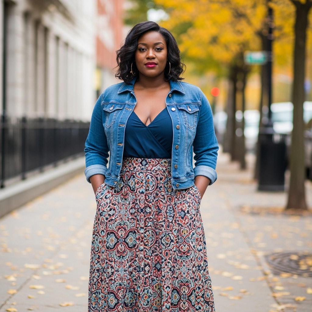 A classic denim jacket styled with a flowy printed maxi skirt strikes the perfect balance between casual and boho chic. Add a fitted top underneath to balance proportions and style with boots or flats. This look is versatile and easy to wear for everyday activities. The denim brings structure, while the skirt adds femininity and free-spirited charm. Together, they create a timeless fall outfit that’s effortlessly stylish.