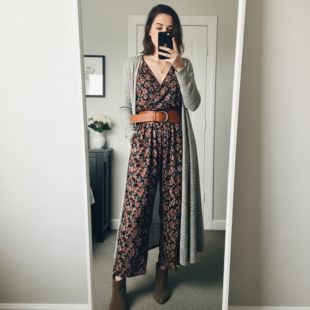 A flowy jumpsuit is both comfortable and stylish, making it a fall boho essential. Cinch it at the waist with a wide belt to add shape and definition. Pair with a long cardigan or duster coat for layering, and finish the look with suede boots. This outfit is practical for daytime wear but easily transitions into the evening with statement accessories. It’s a versatile piece every boho wardrobe should have.
