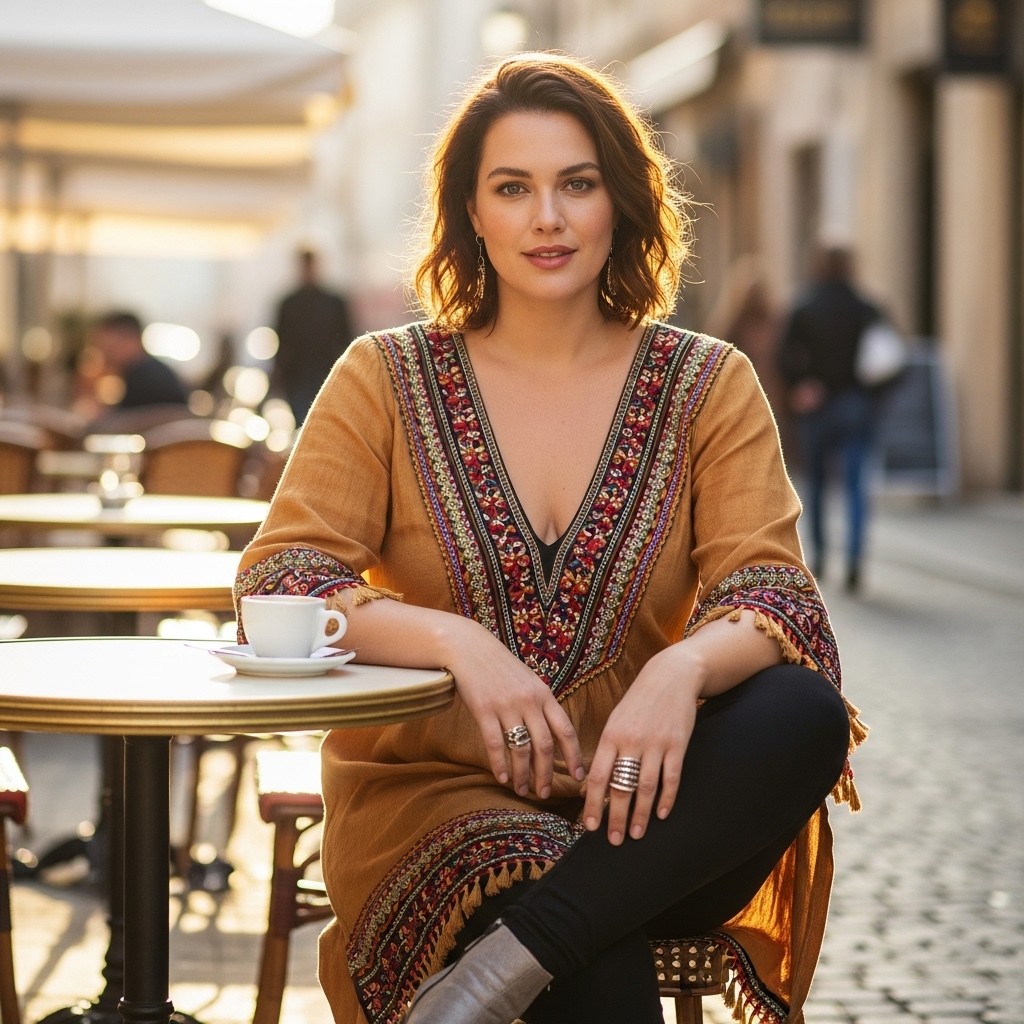 A loose, embroidered boho tunic paired with leggings creates a chic yet practical outfit for busy fall days. The tunic’s flowy design balances the fitted leggings, giving the look both comfort and style. Pair with ankle boots or moccasins, and add layered necklaces for a complete boho vibe. This outfit works perfectly for running errands, casual meetups, or cozy days at home while still feeling polished and free-spirited.